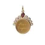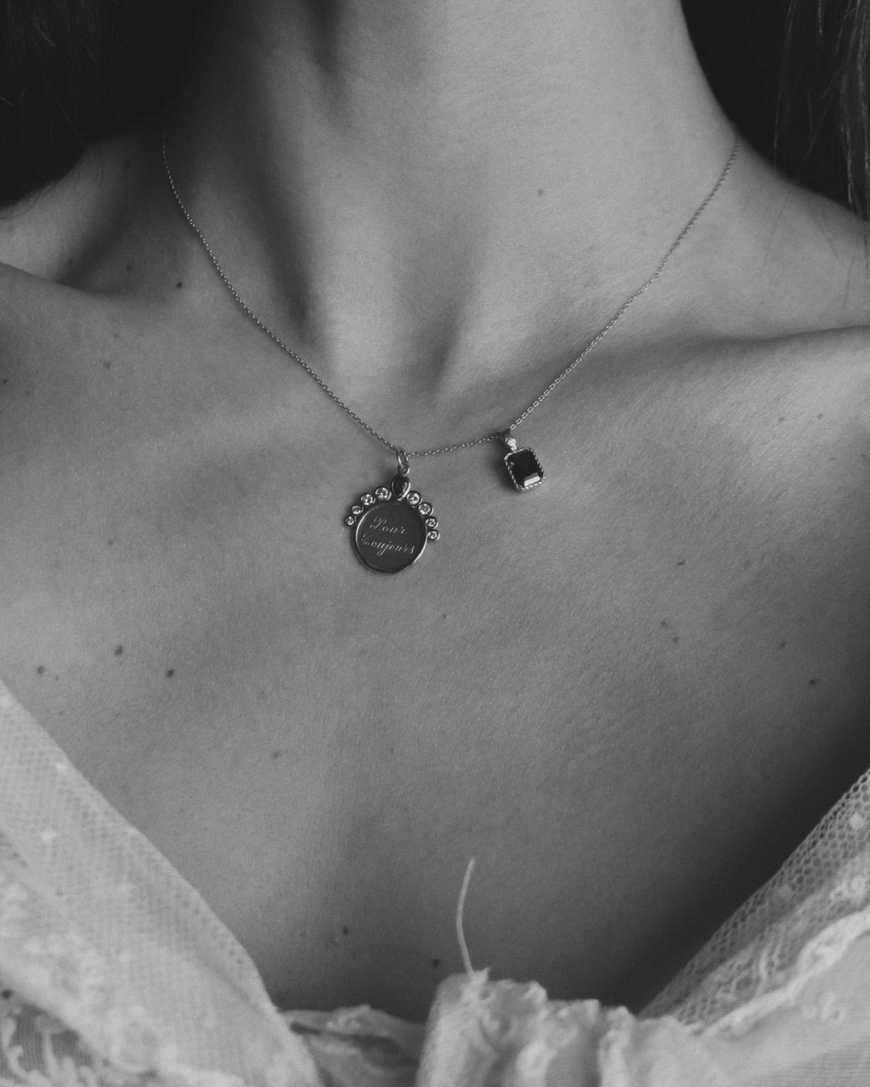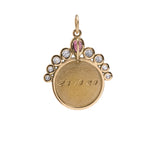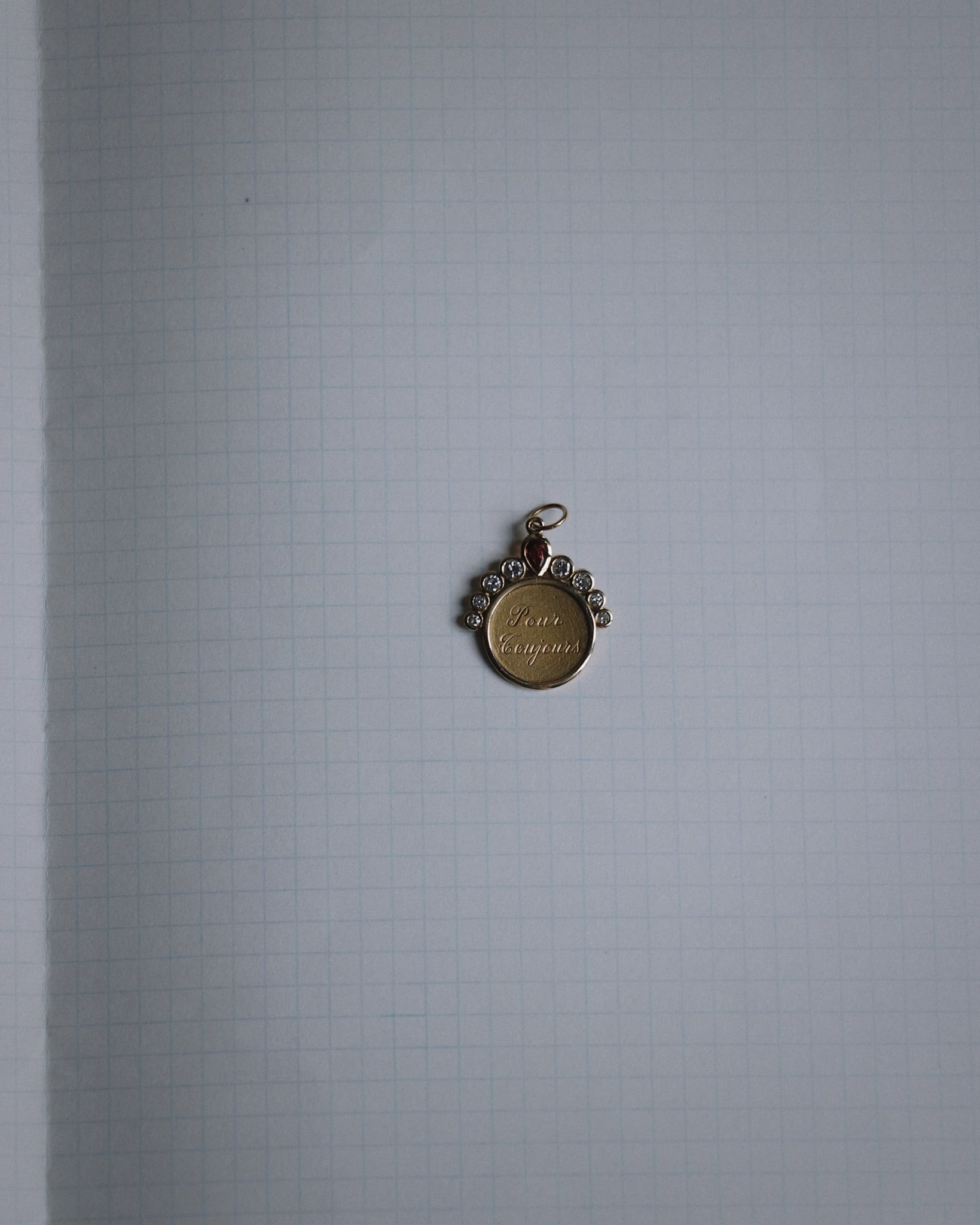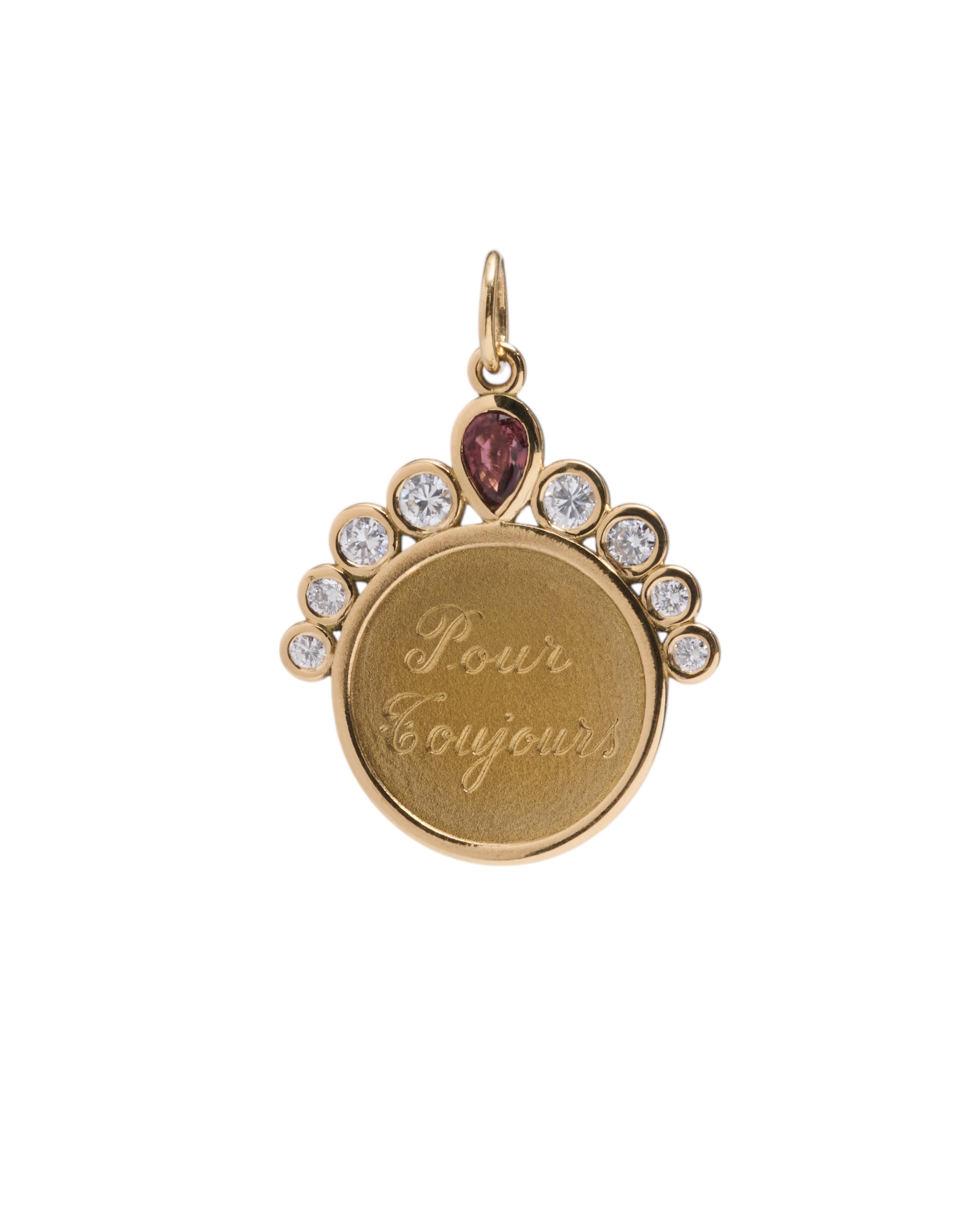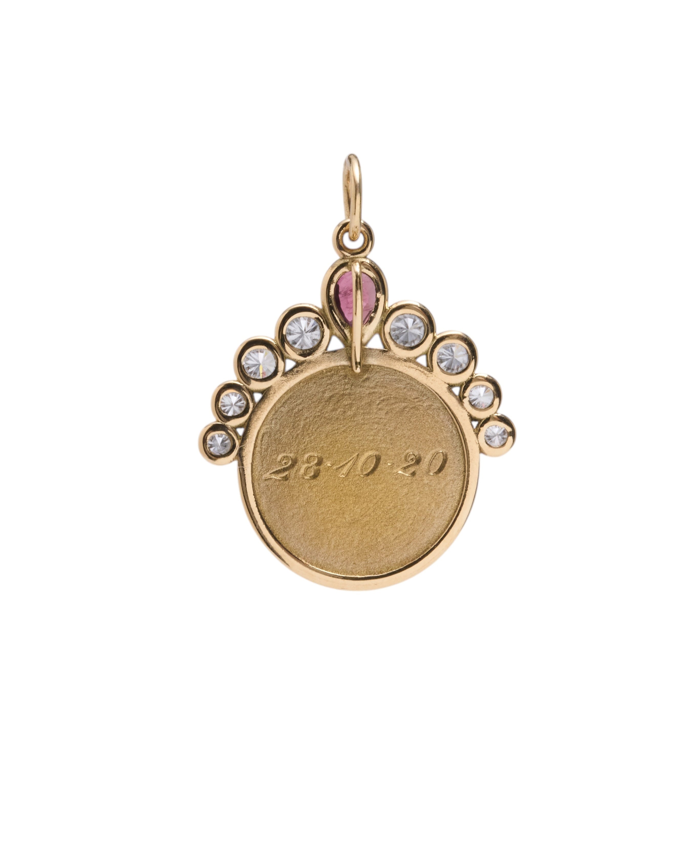 This medal is special because it seals an eternal love, a story to be written, something that is engraved in you and you want it to always be with you, a date, a name, a memory, a crown of diamonds with a teardrop-shaped rhodolite are the color and light of this jewel.