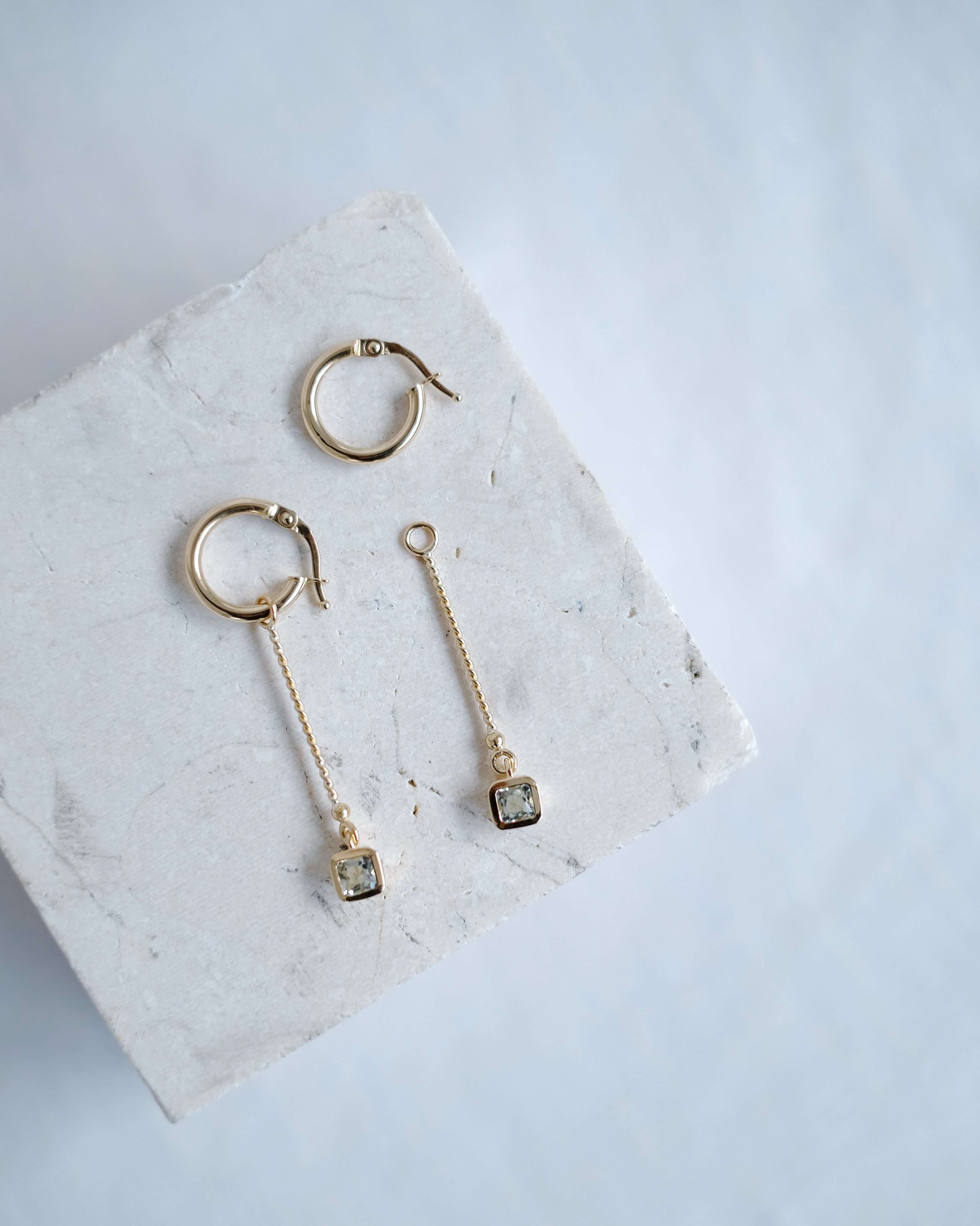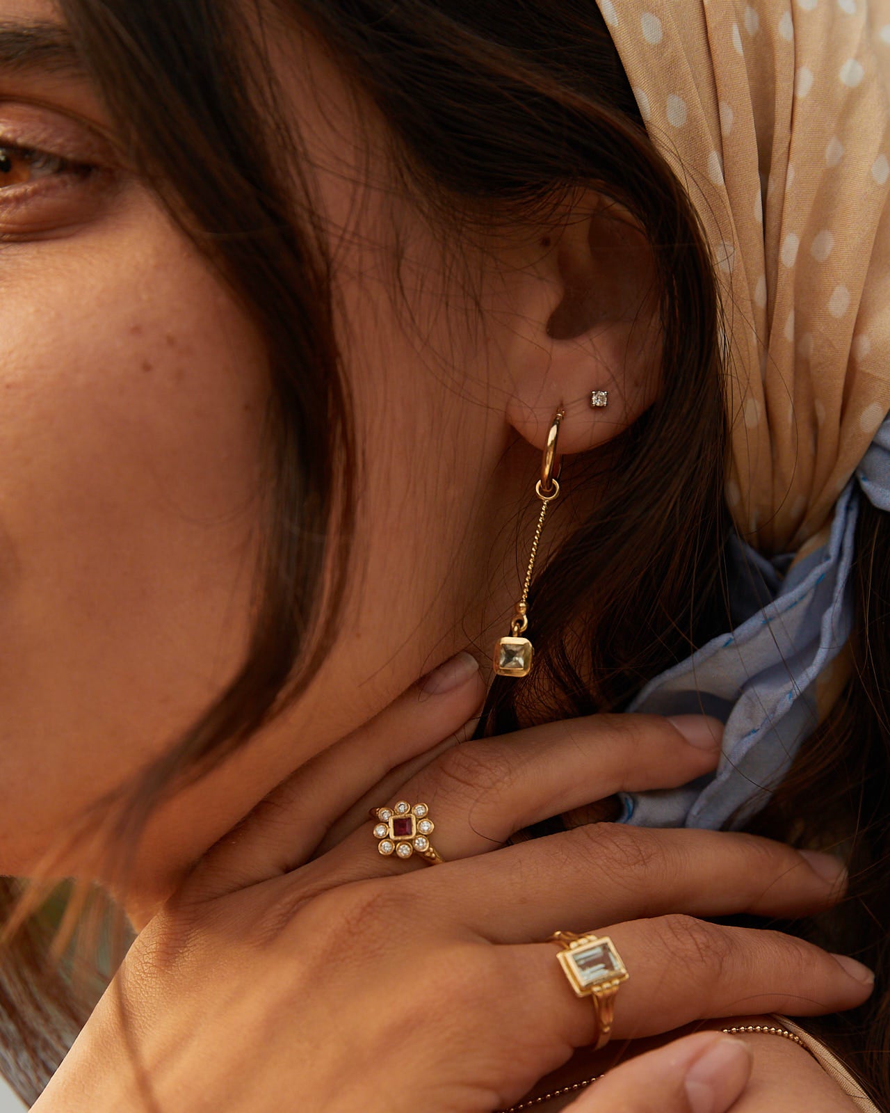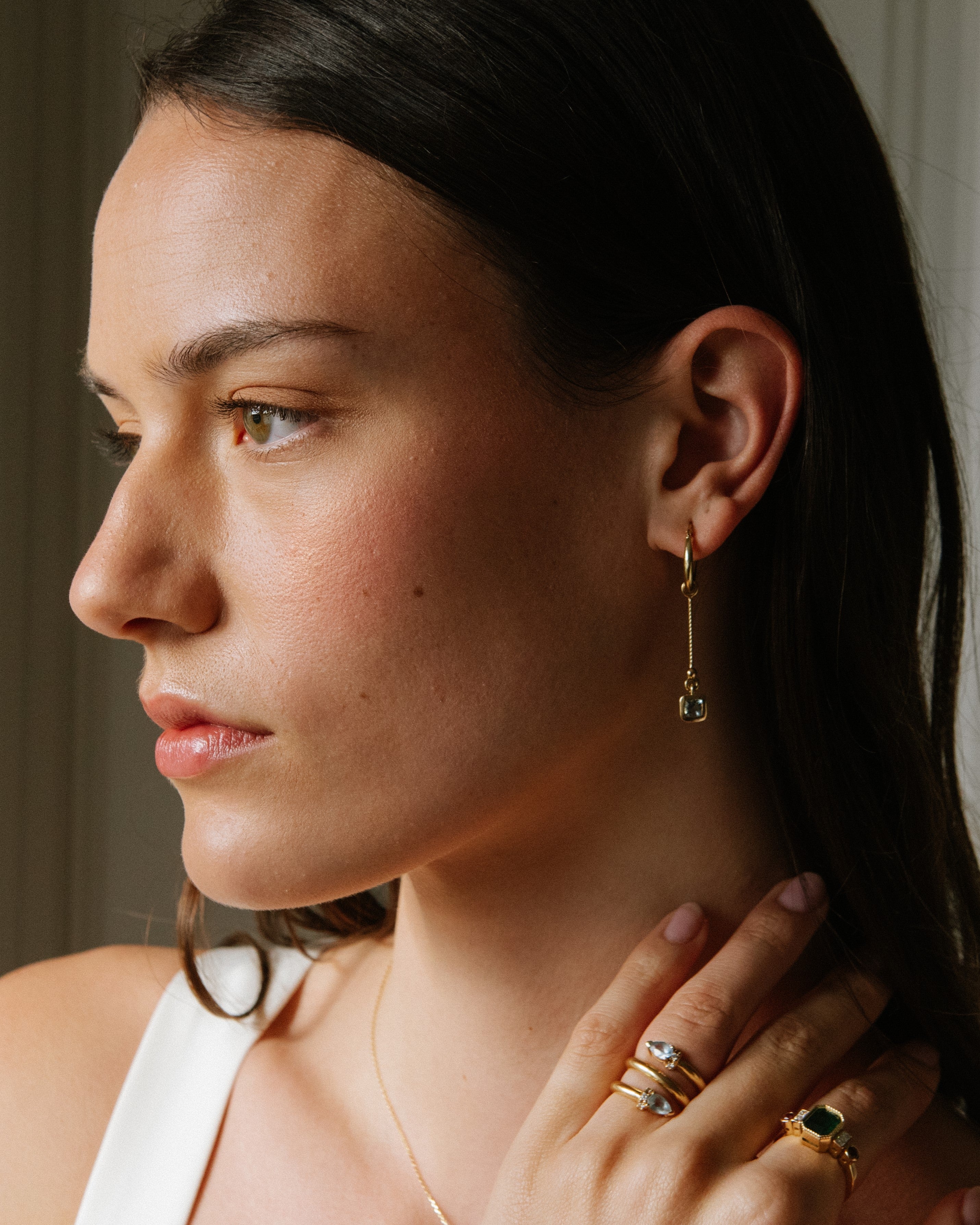 These earrings are the definition of delicacy. Two thin gold strings hold an aquamarine. These strings can be removed, and the earrings become an everyday staple, a gorgeous and simple pair of gold hoops. We love their versatility, whether for an important event with an updo, a special dinner, or for everyday wear.