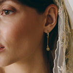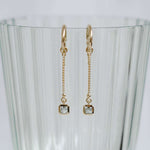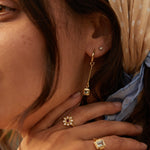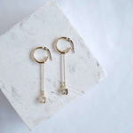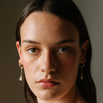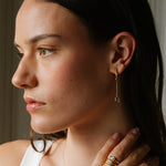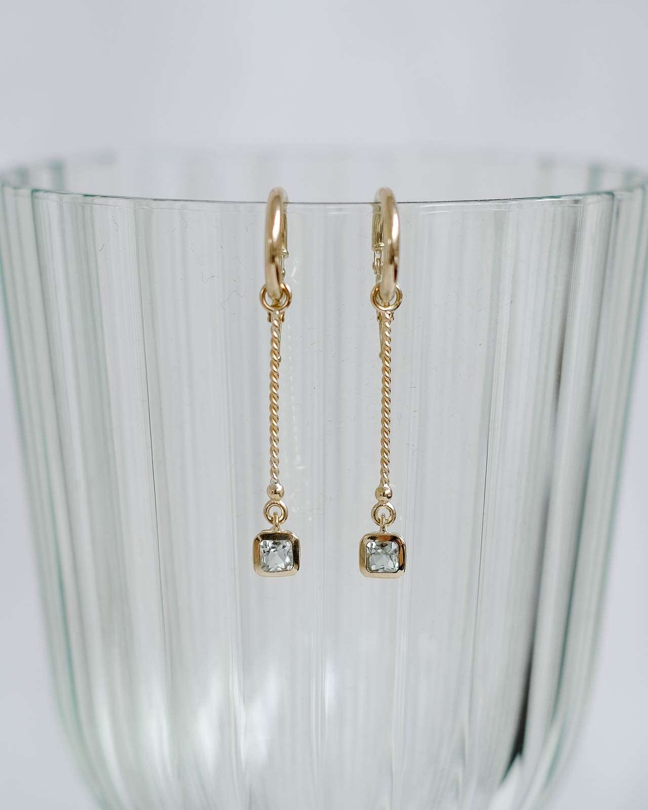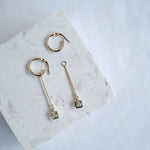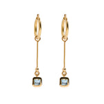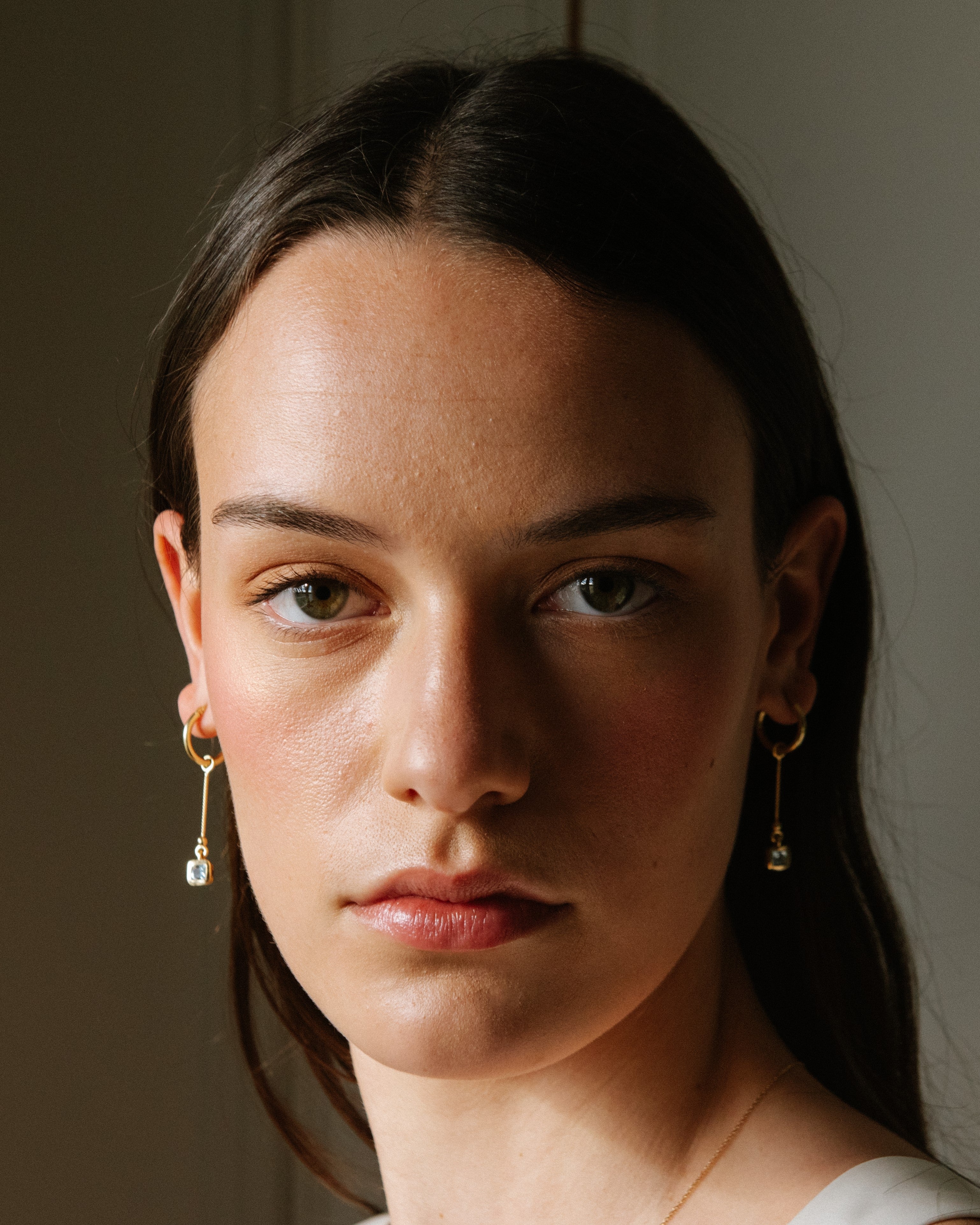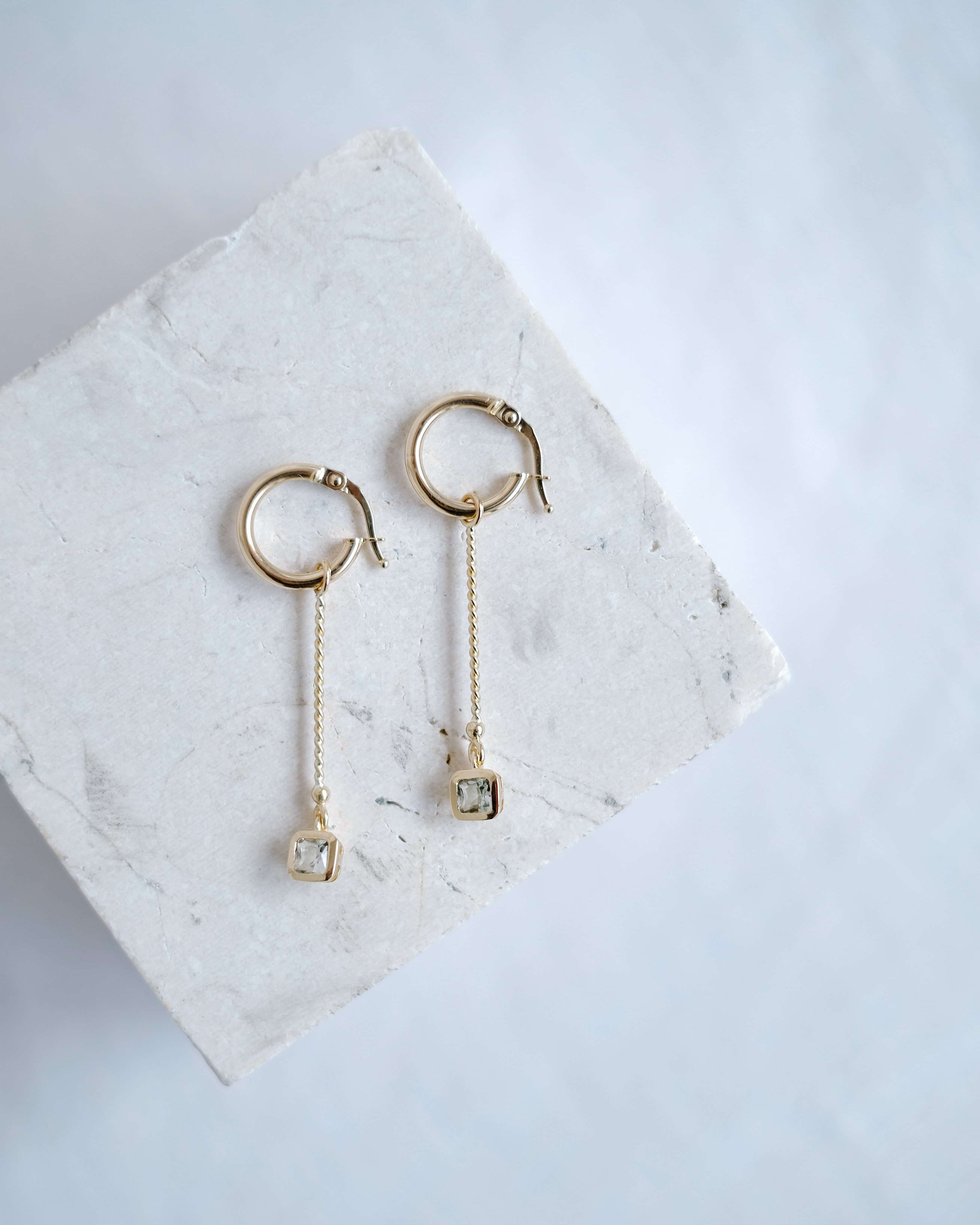 These earrings are the definition of delicacy. Two thin gold strings hold an aquamarine. These strings can be removed, and the earrings become an everyday staple, a gorgeous and simple pair of gold hoops. We love their versatility, whether for an important event with an updo, a special dinner, or for everyday wear.