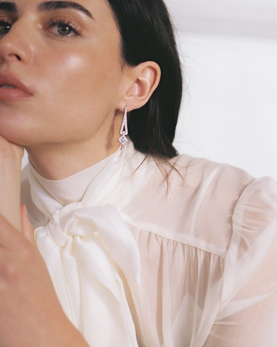 Our star piece in white gold, these earrings are inspired by the Art Deco era. In this period, inspiration came from the Bauhaus, but there was also a great influence from the archaeological world, specifically from Pharaonic Egyptian jewelry. Aquamarine is the main stone of this piece, although as in Art Deco jewelry, diamonds accompany the entire outline of the jewel. Aquamarine is the stone of courage, and helps to calm the mind.