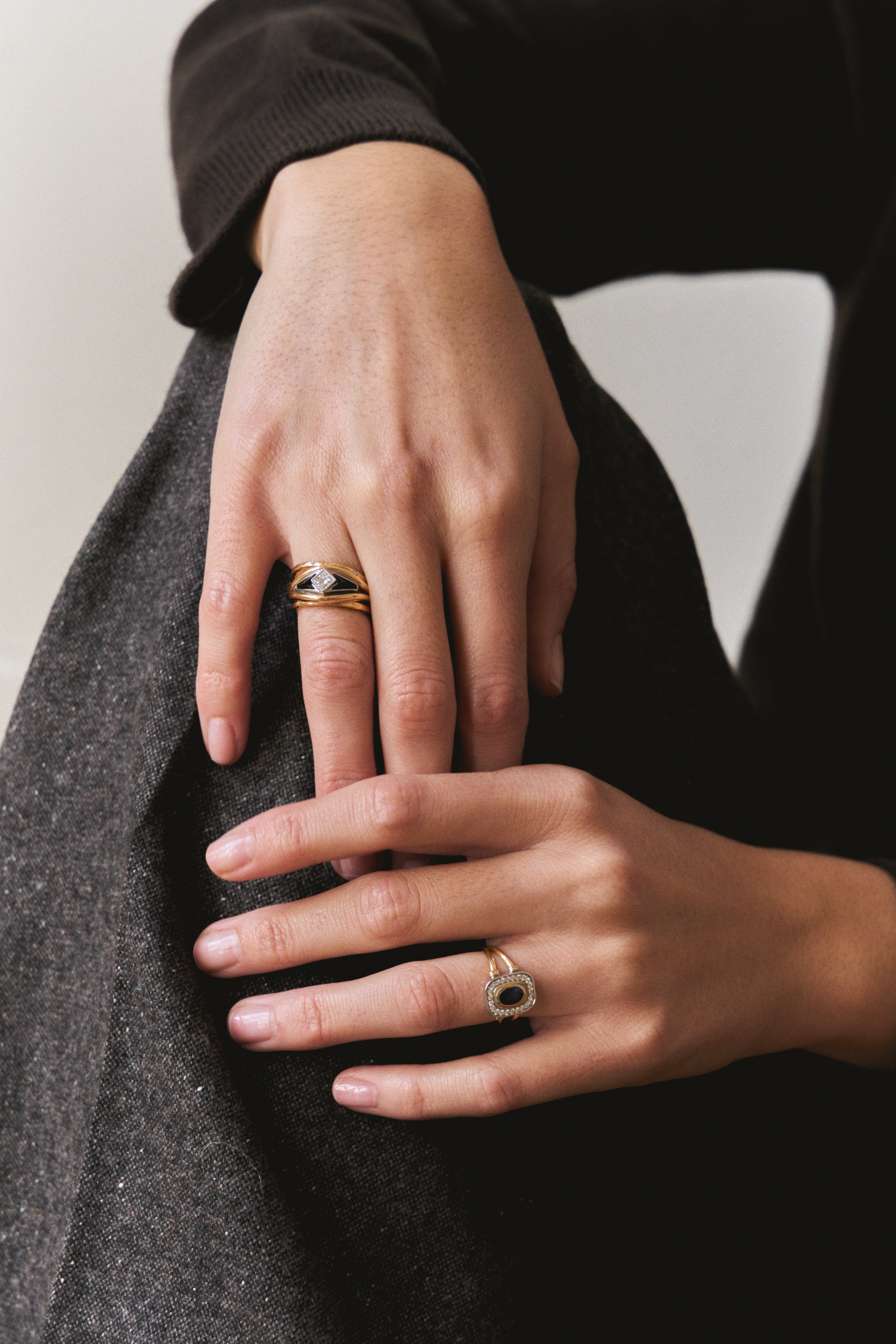 This beautiful piece, with a modern design due to its straight lines, shines due to the combination of onyx and diamond. The diamond reflects purity and fidelity, and onyx is a protective stone that absorbs negative energies.