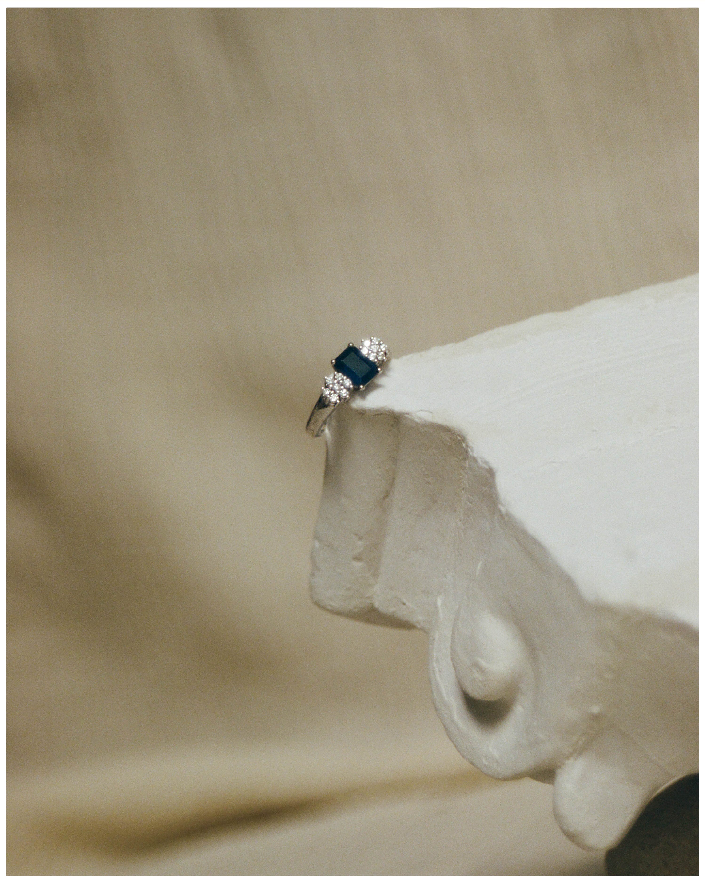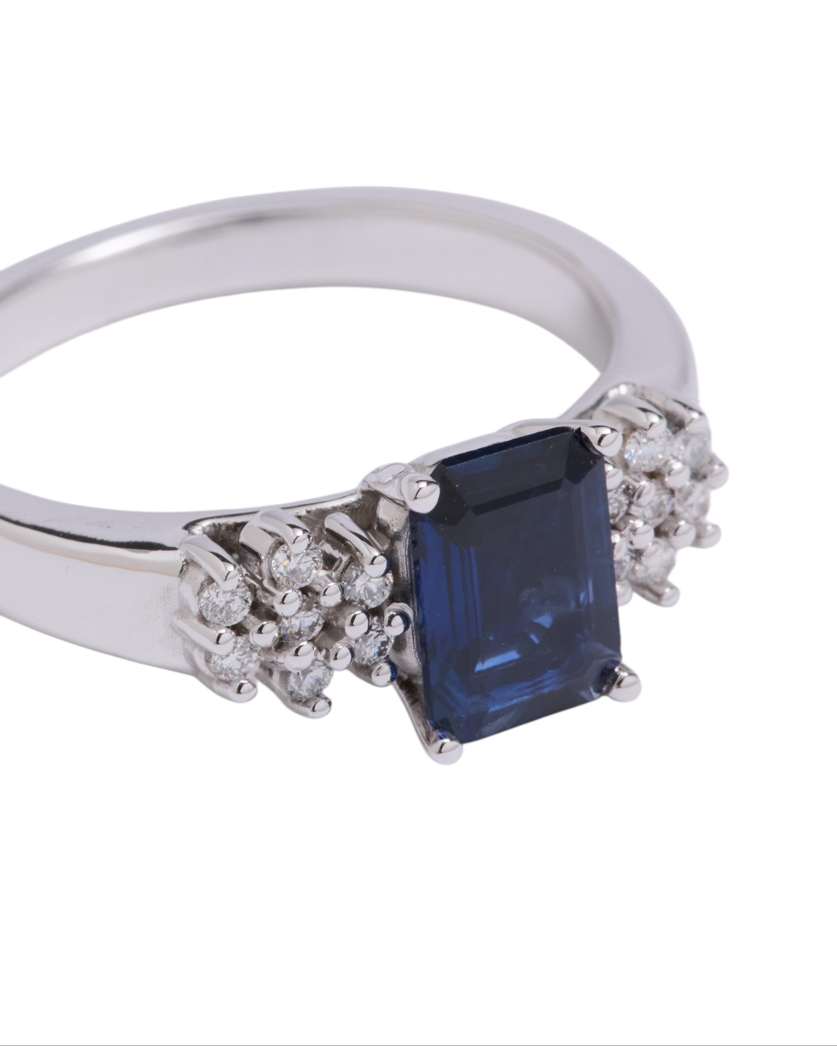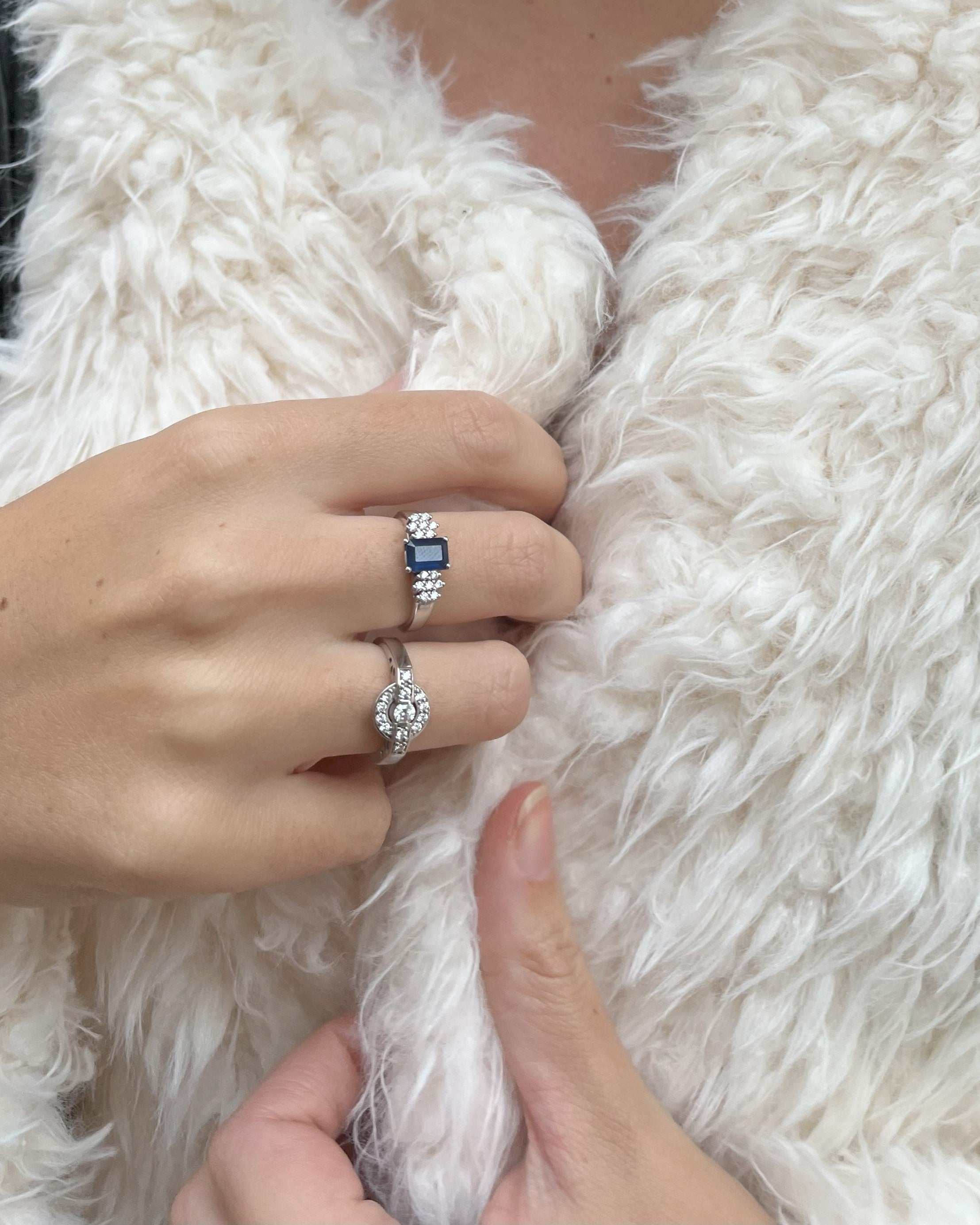 We have created this variation of one of your favourite designs, the Aura ring is made of white gold, with diamonds and a central sapphire, an ideal design for a marriage proposal. The goddess Aura is the divine personification of the breeze and was as fast as the wind, as light as the breeze and as strong as the wind, that is our Aura ring.