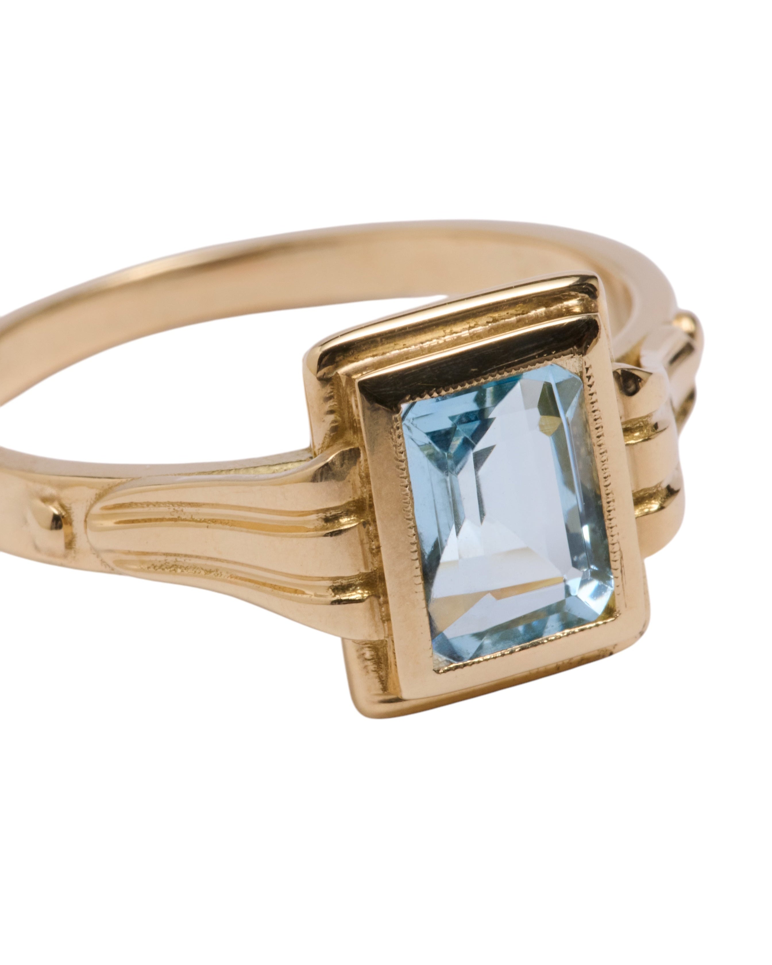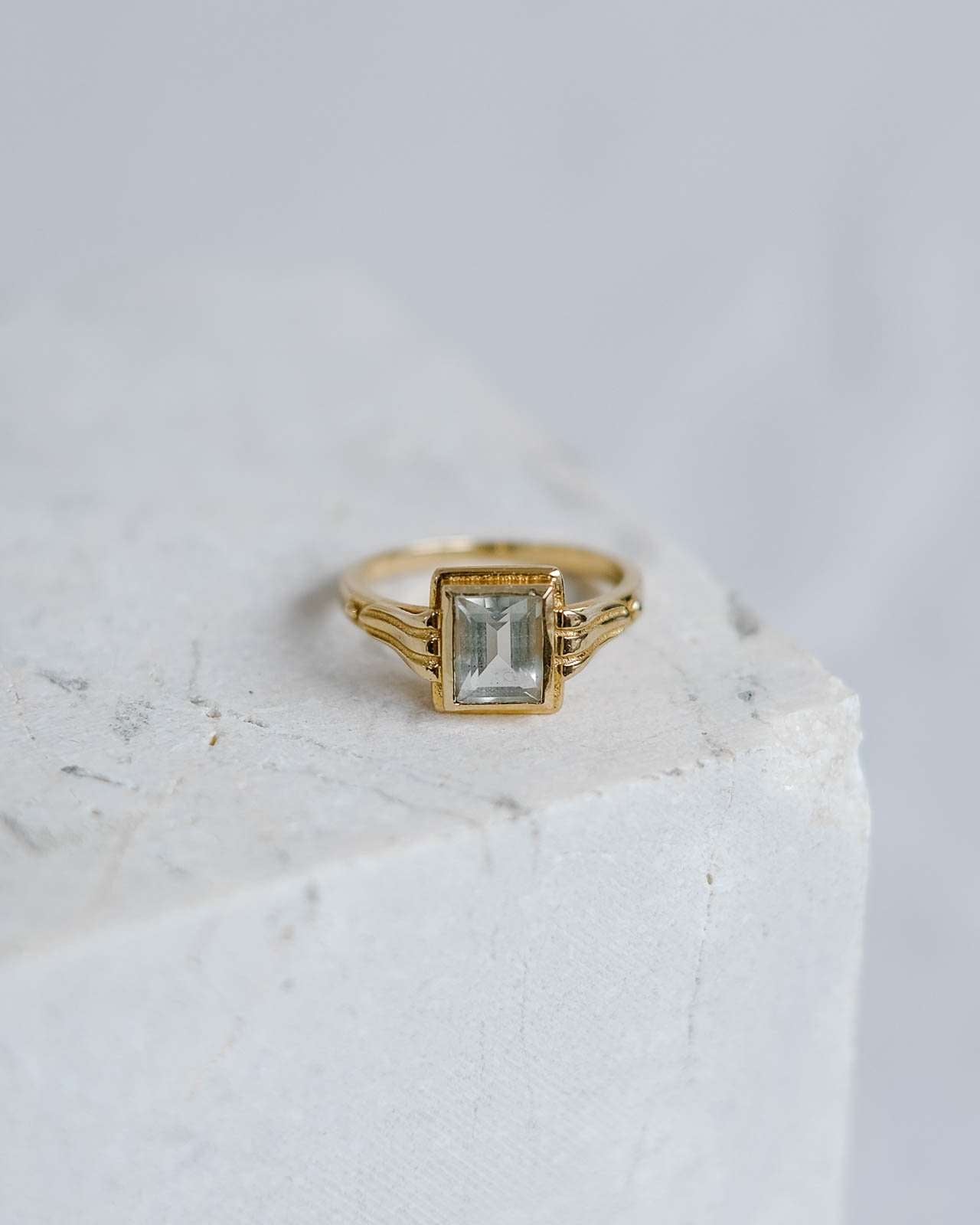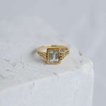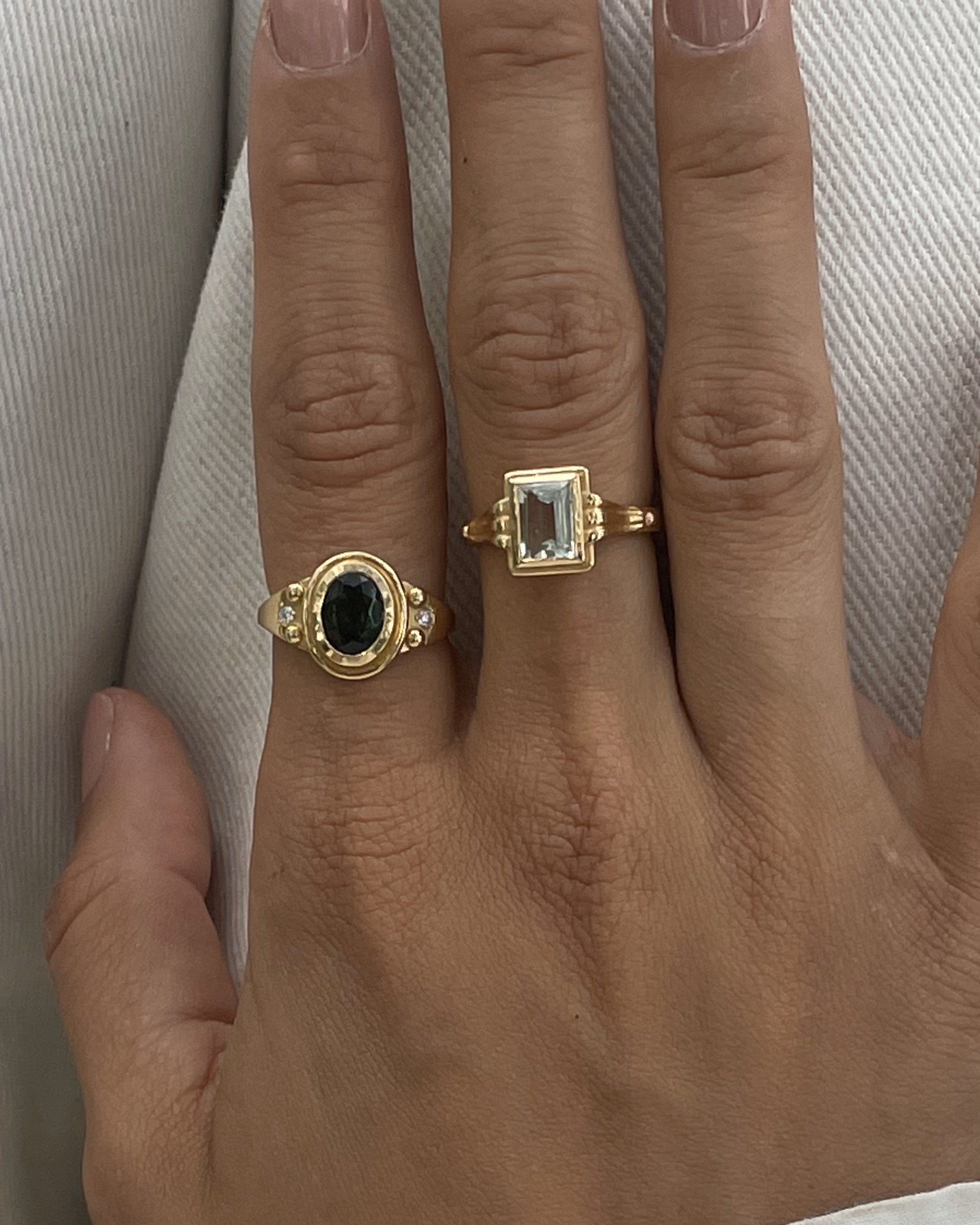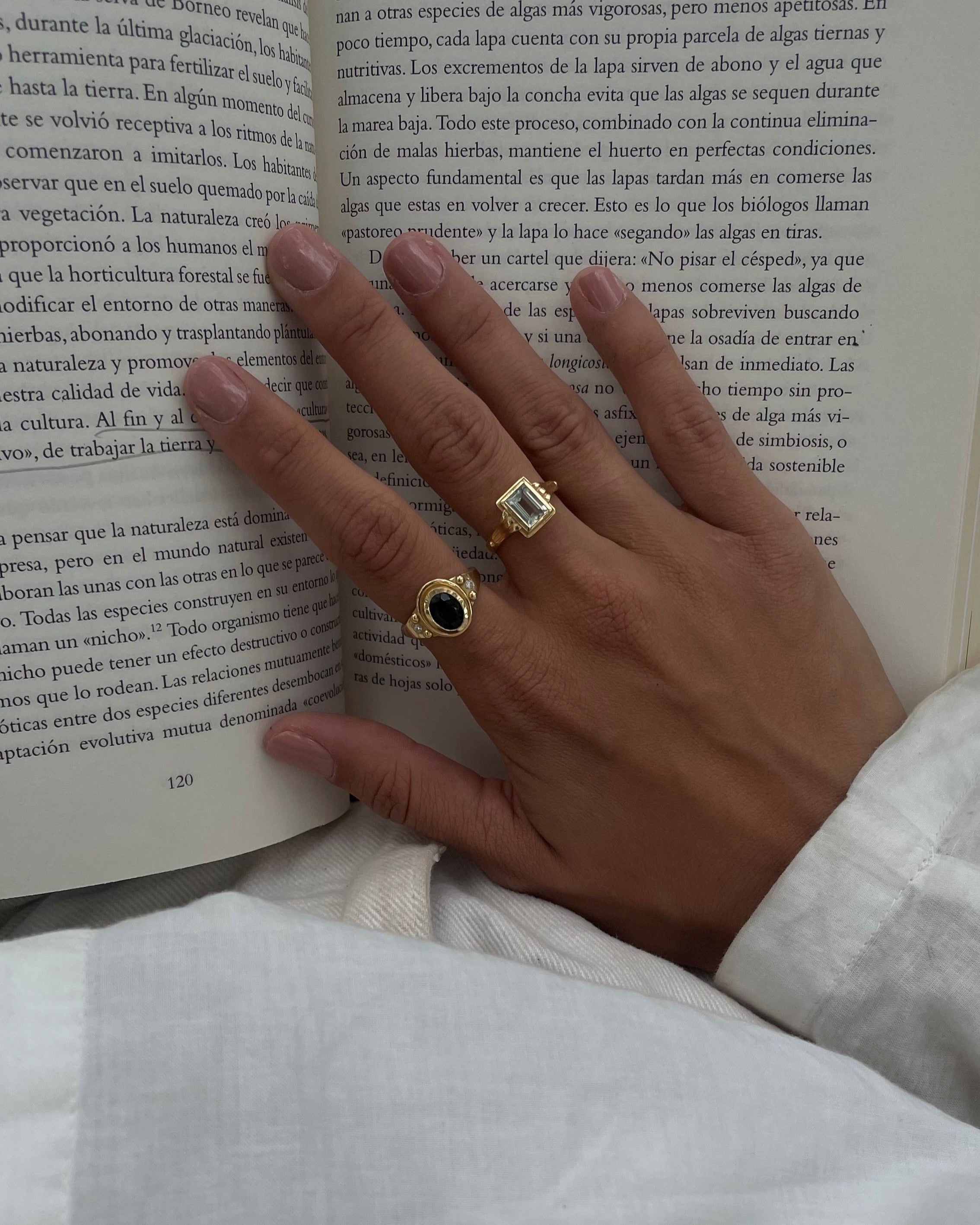 This ring transports us to another era, the aquamarine is the central stone of this piece. This stone is linked to the element of the earth, the energies of inner vision and self-love. It has a great spiritual charge, and its tone transports us to the crystal-clear waters of some magical place.