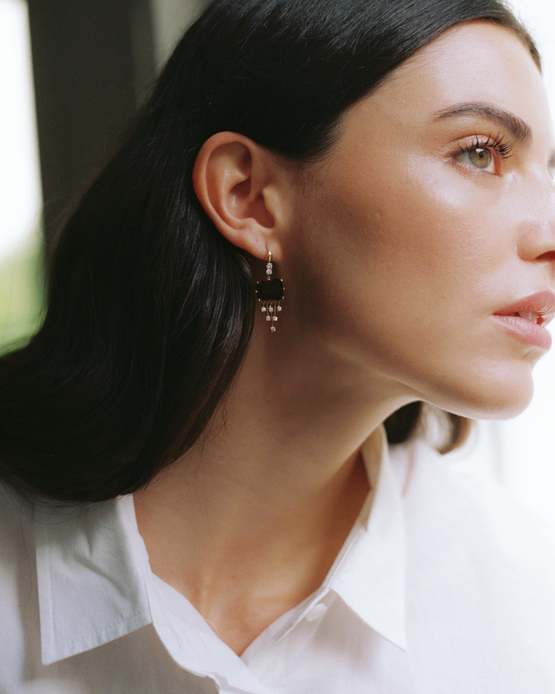 Un diseño original y lleno de movimiento. La piedra protagonista es un cuarzo ahumado engastado en garras, del que nace una cascada de diamantes dispuestos en forma de racimo. Este diseño combina la sobriedad de lo moderno con la ligereza de la cascada de diamantes en movimiento.