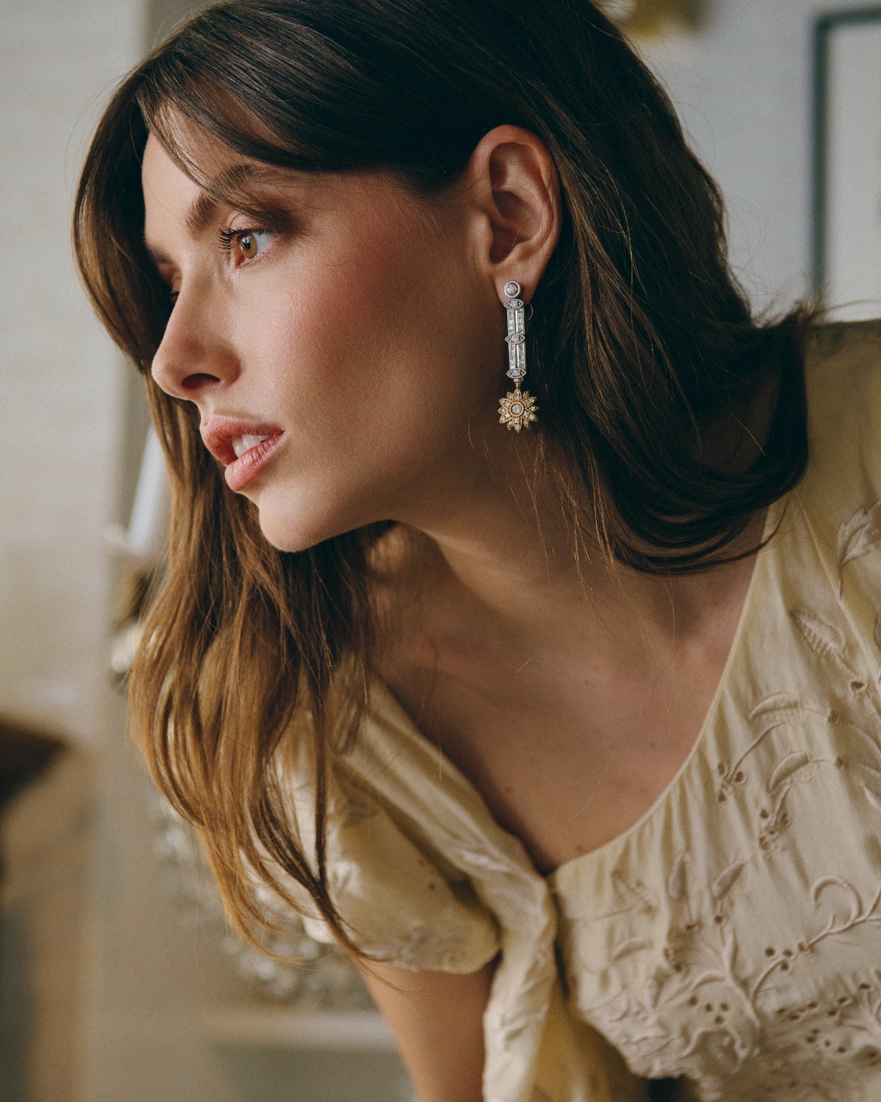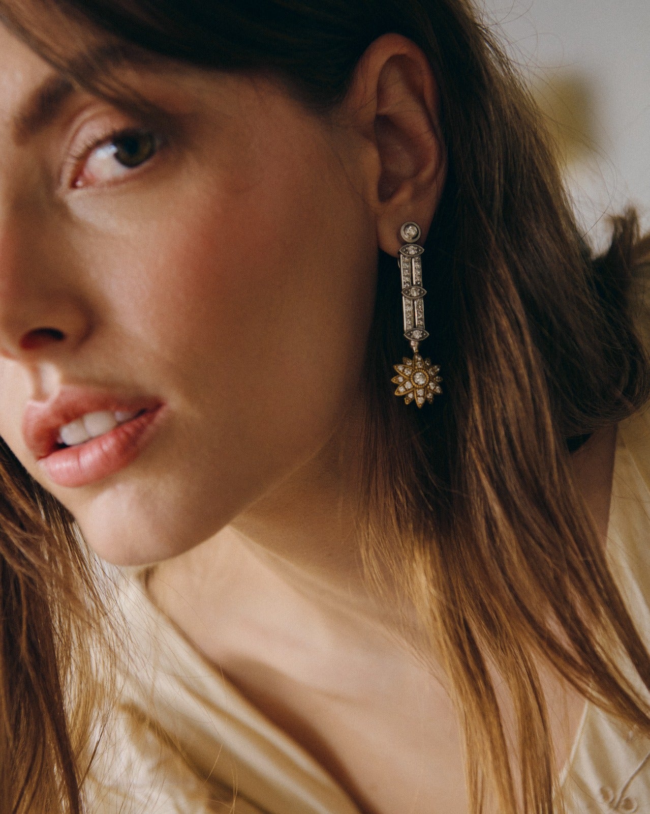 Estos pendientes son pura luz, la expresión de la feminidad, la piedra protagonista son los diamantes de diferentes tallas, un diseño que juega con la combinación de oro blanco y oro amarillo, y remarcan la fuerza y la grandeza, y el resultado es una obra de arte.
