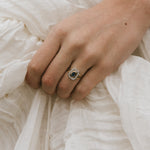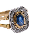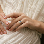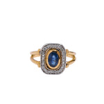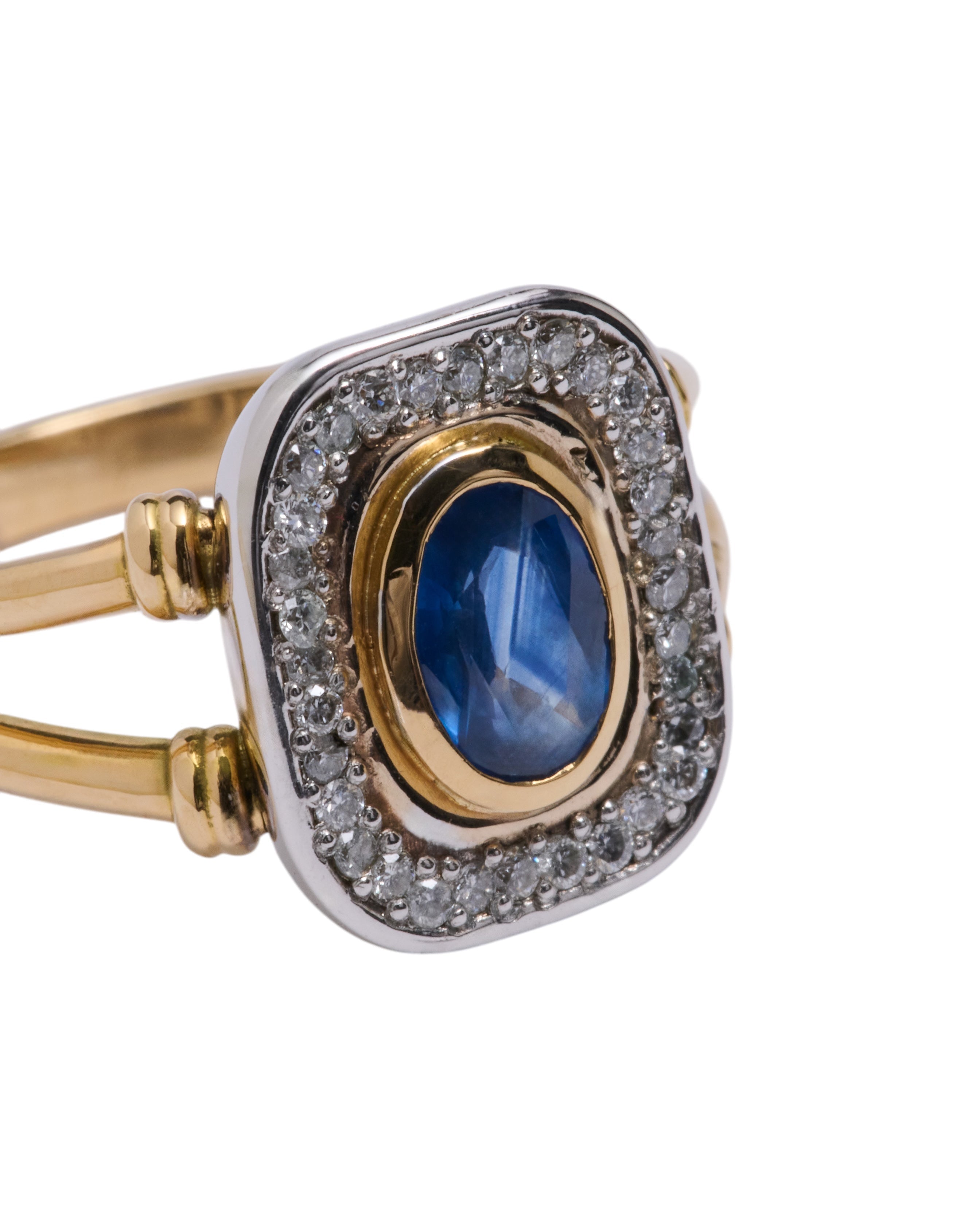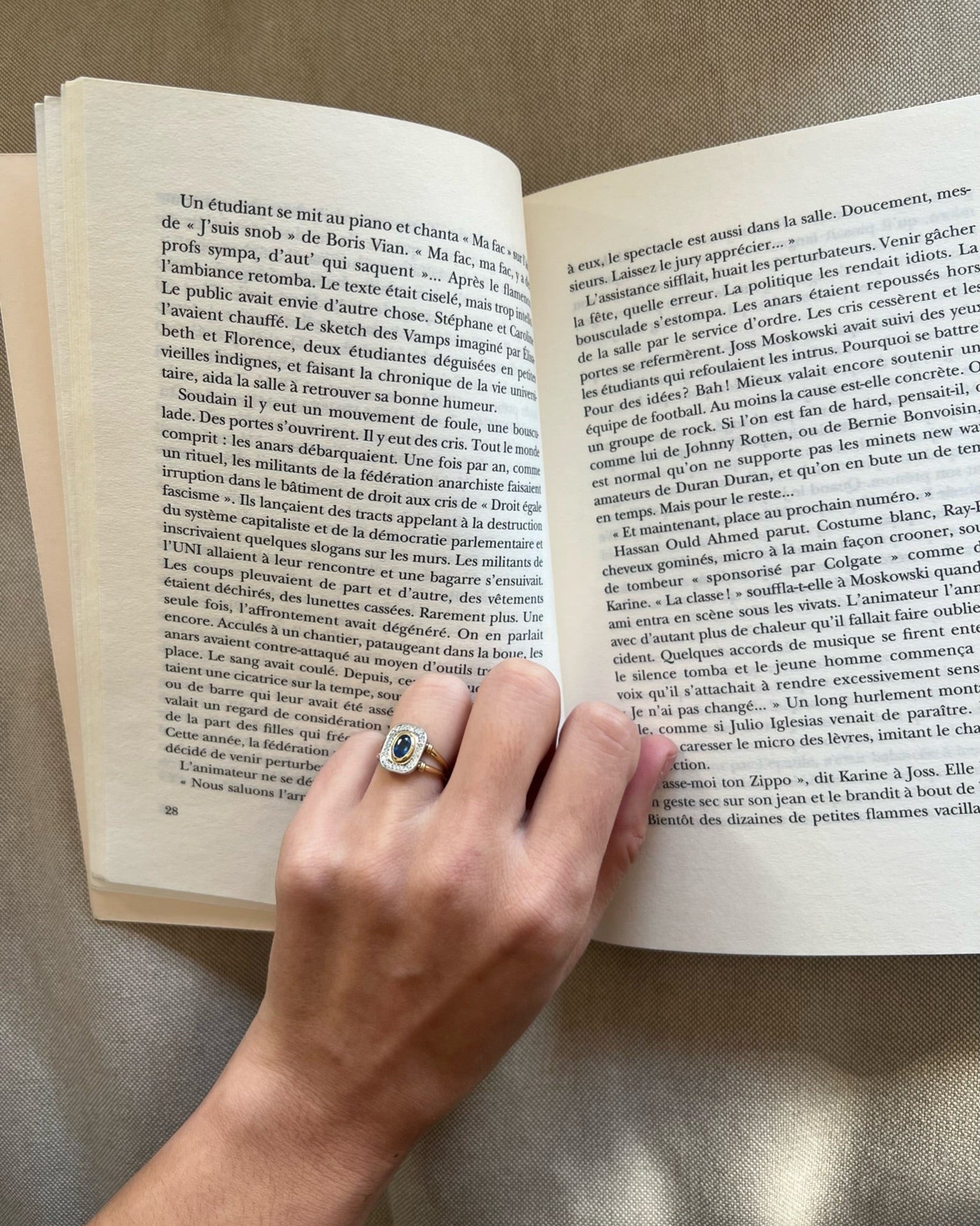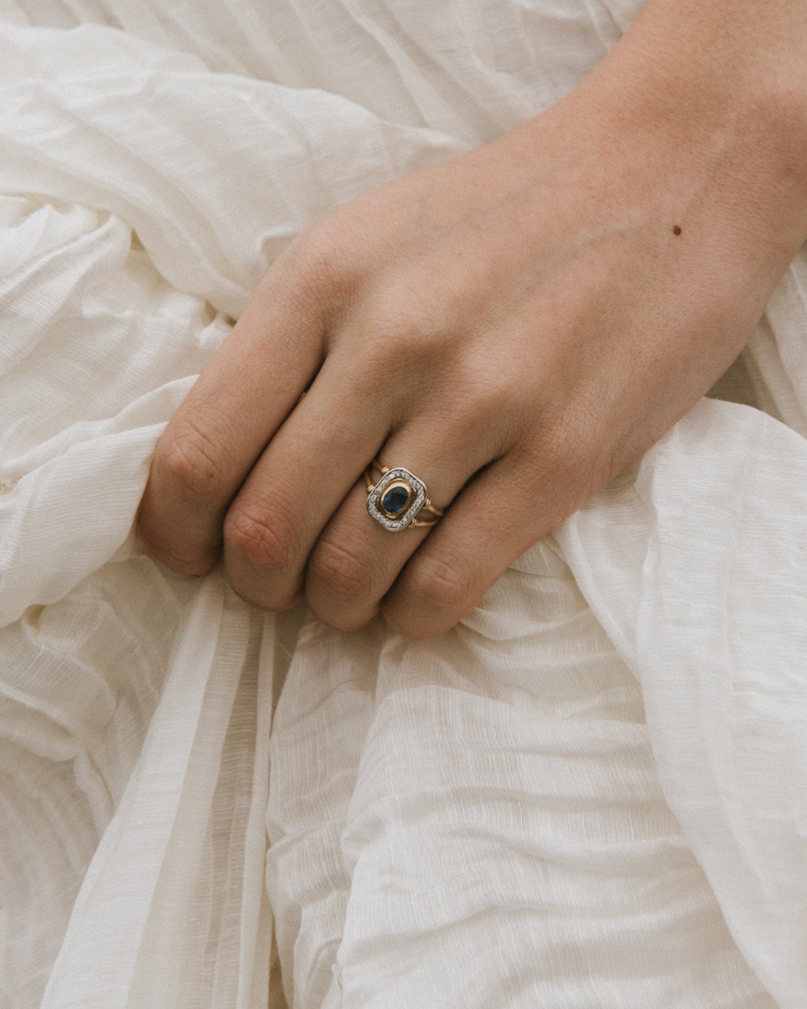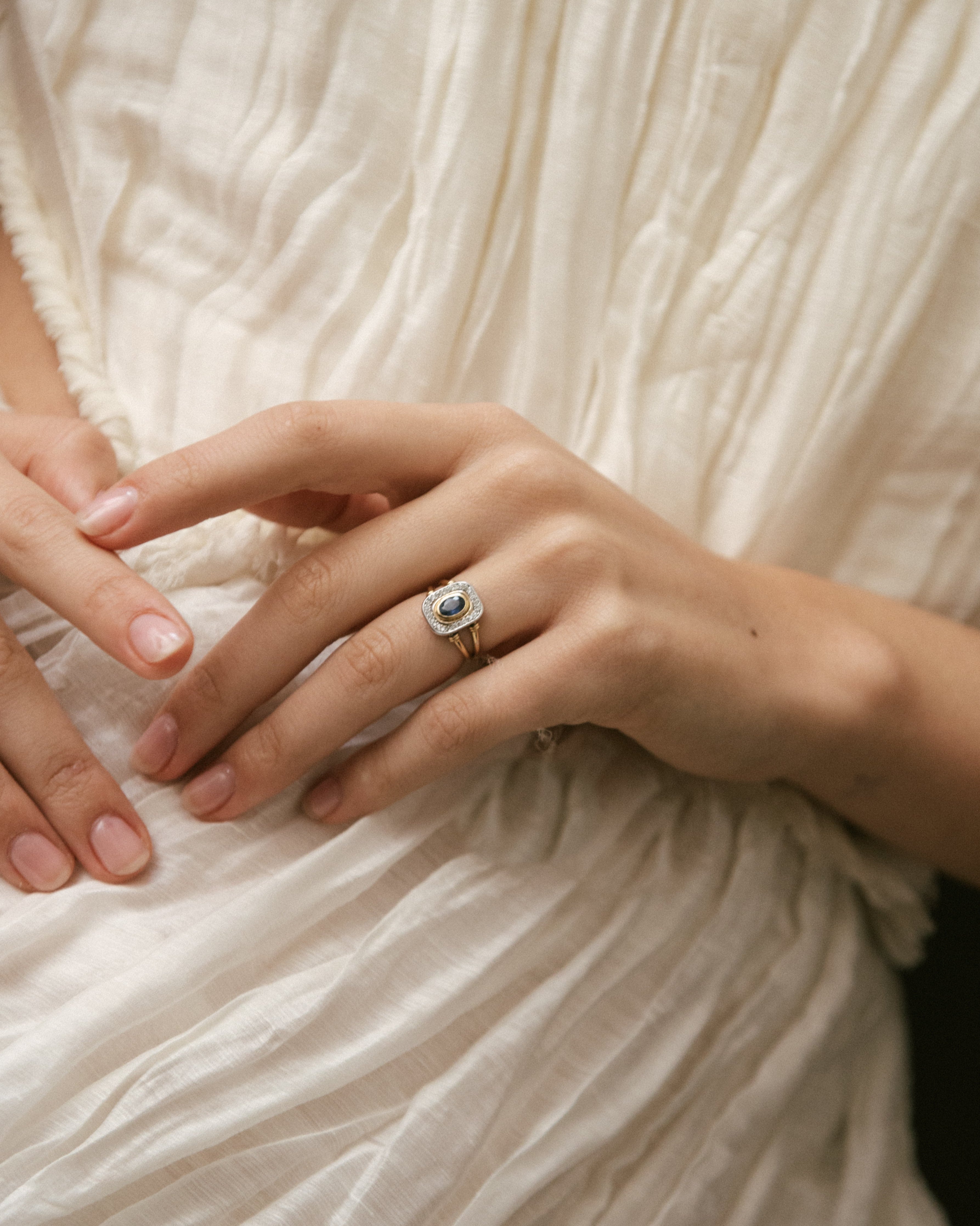 El zafiro central de esta joya te hipnotizará, con una corona de diamantes que lo rodean, esta sortija está inspirada en una joya antigua que le regaló una madre a una hija, y cuenta una preciosa historia, evoca la belleza de otros tiempos, con un diseño romántico y elegante. Pura inspiración. Algún día pertenecerá a Aluna y contará su propia historia.