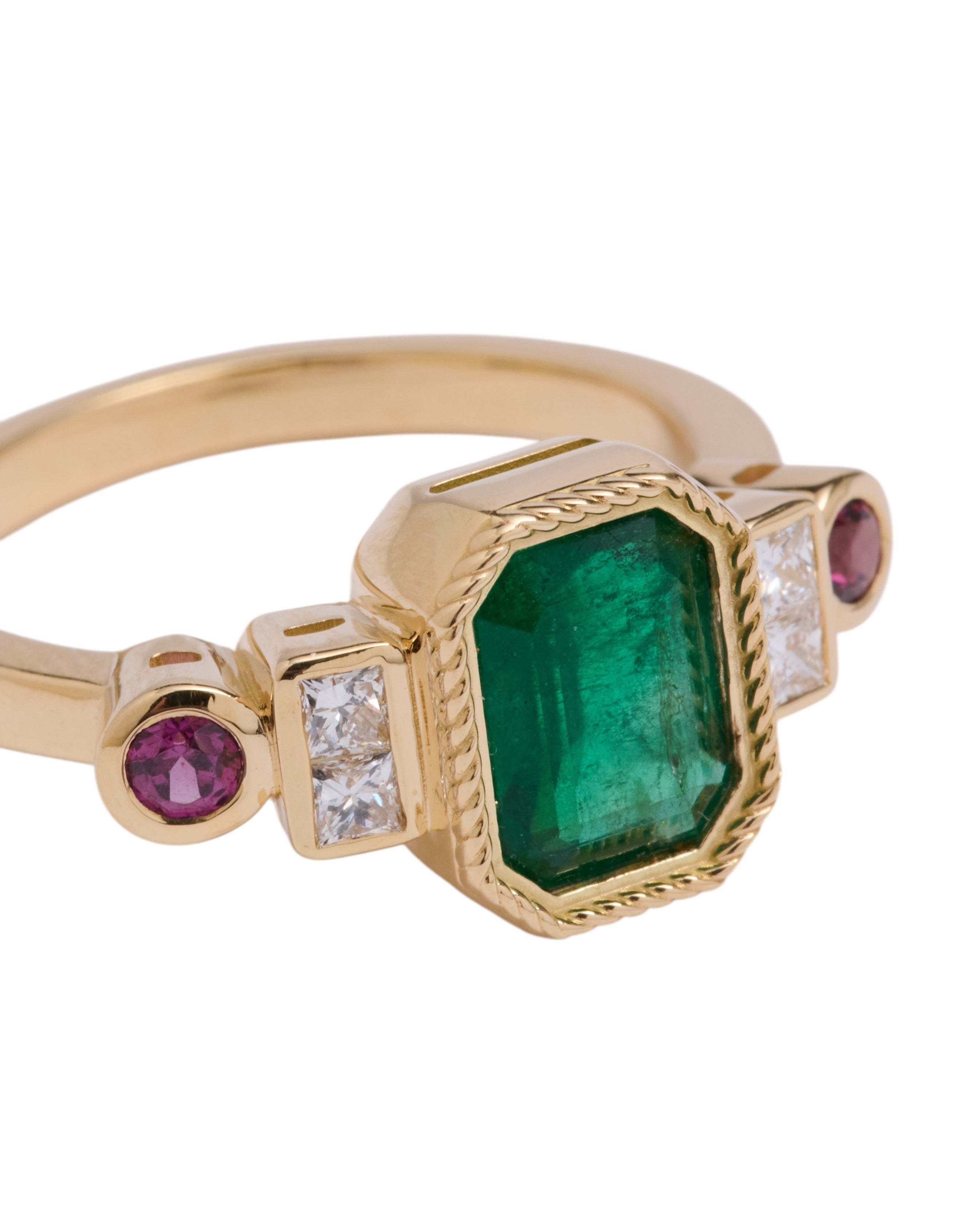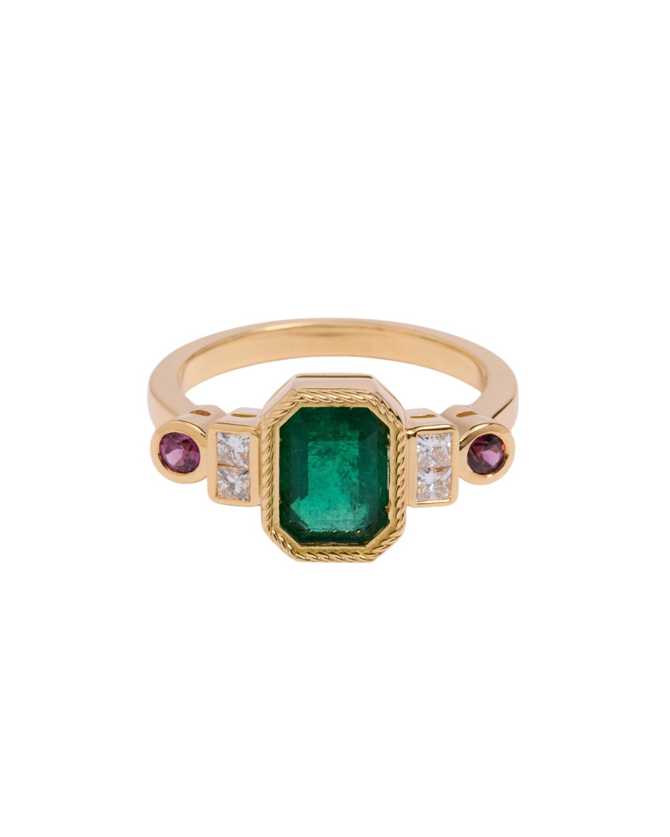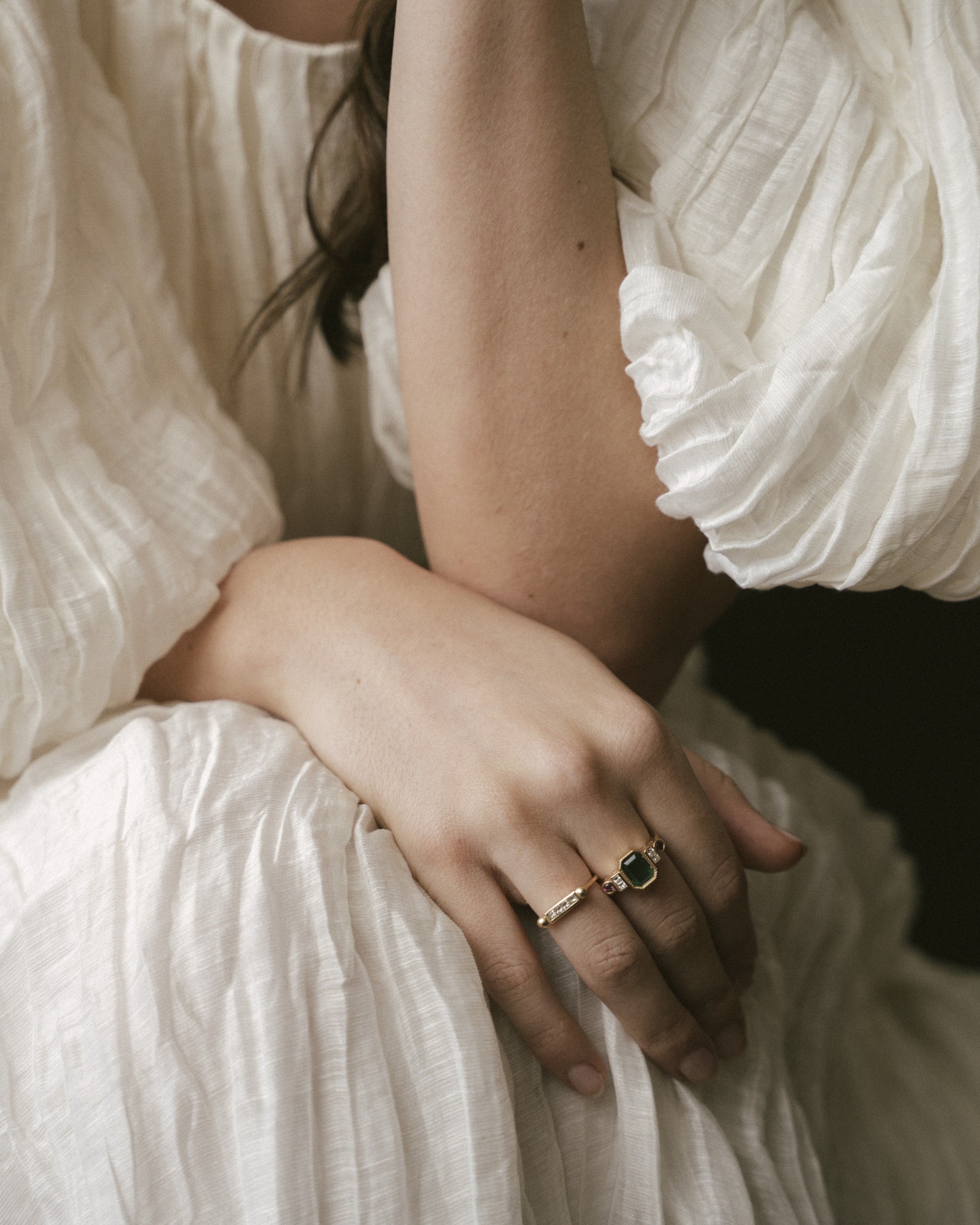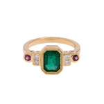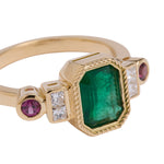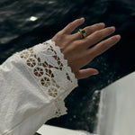 La joya de la corona de esta colección, esta sortija tiene como protagonista una esmeralda que nos cautiva nada más observarla, y nos conecta con la naturaleza más profunda. La esmeralda es, sin duda, una de las piedras más mágicas que existe, con sus irregularidades conocidas como 'jardines' no hay dos iguales, y eso es lo que las hace tan especiales. Esta sortija es una oda al jardín con sus colores y belleza.