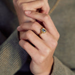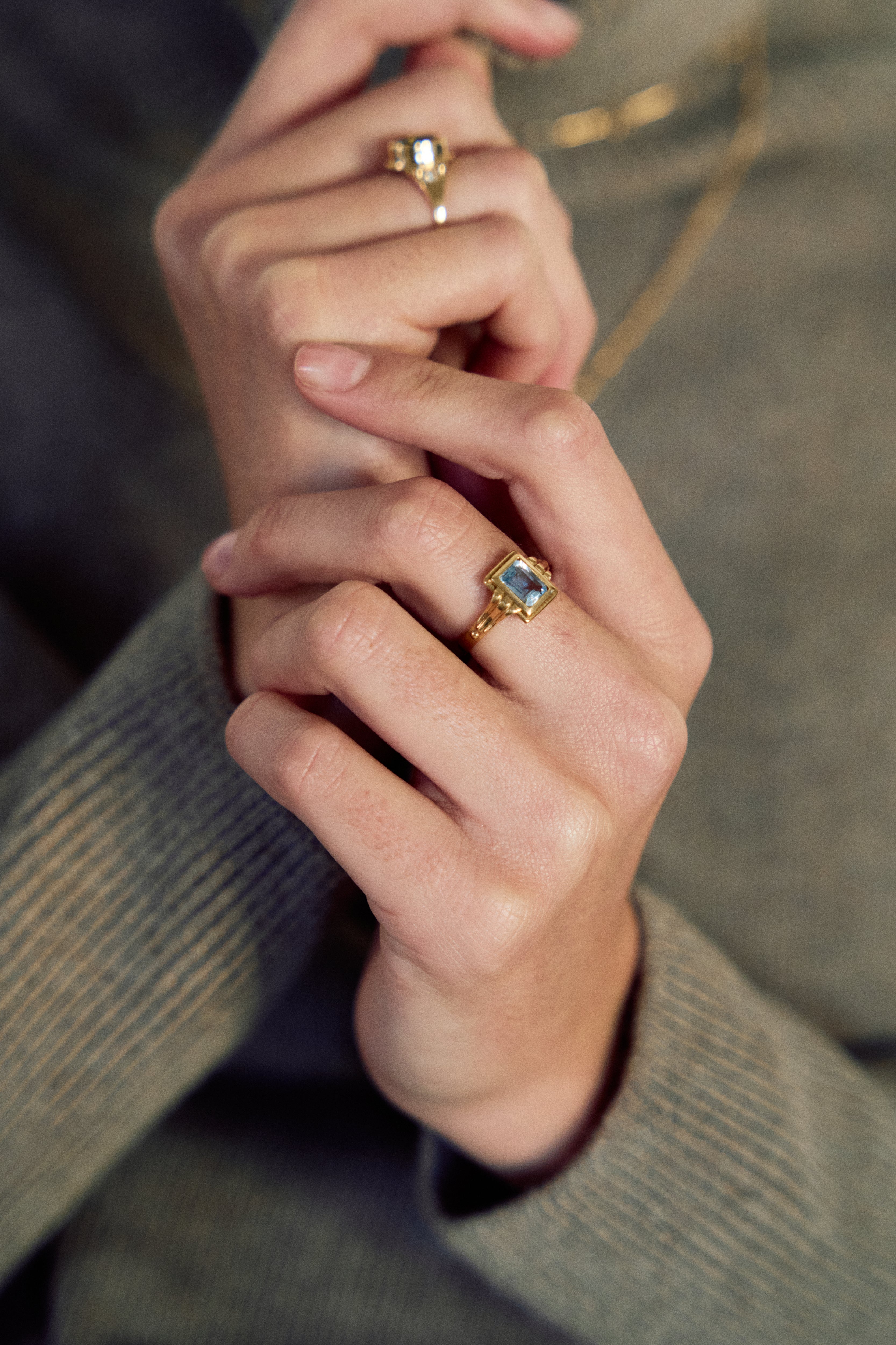 Esta sortija nos transporta a otra época, la aguamarina es la piedra central de esta pieza. Esta piedra está ligada al elemento de la tierra, las energías de la visión interior y el amor propio. Tiene una gran carga espiritual, y su tono nos transporta a aguas cristalinas de algún lugar mágico.