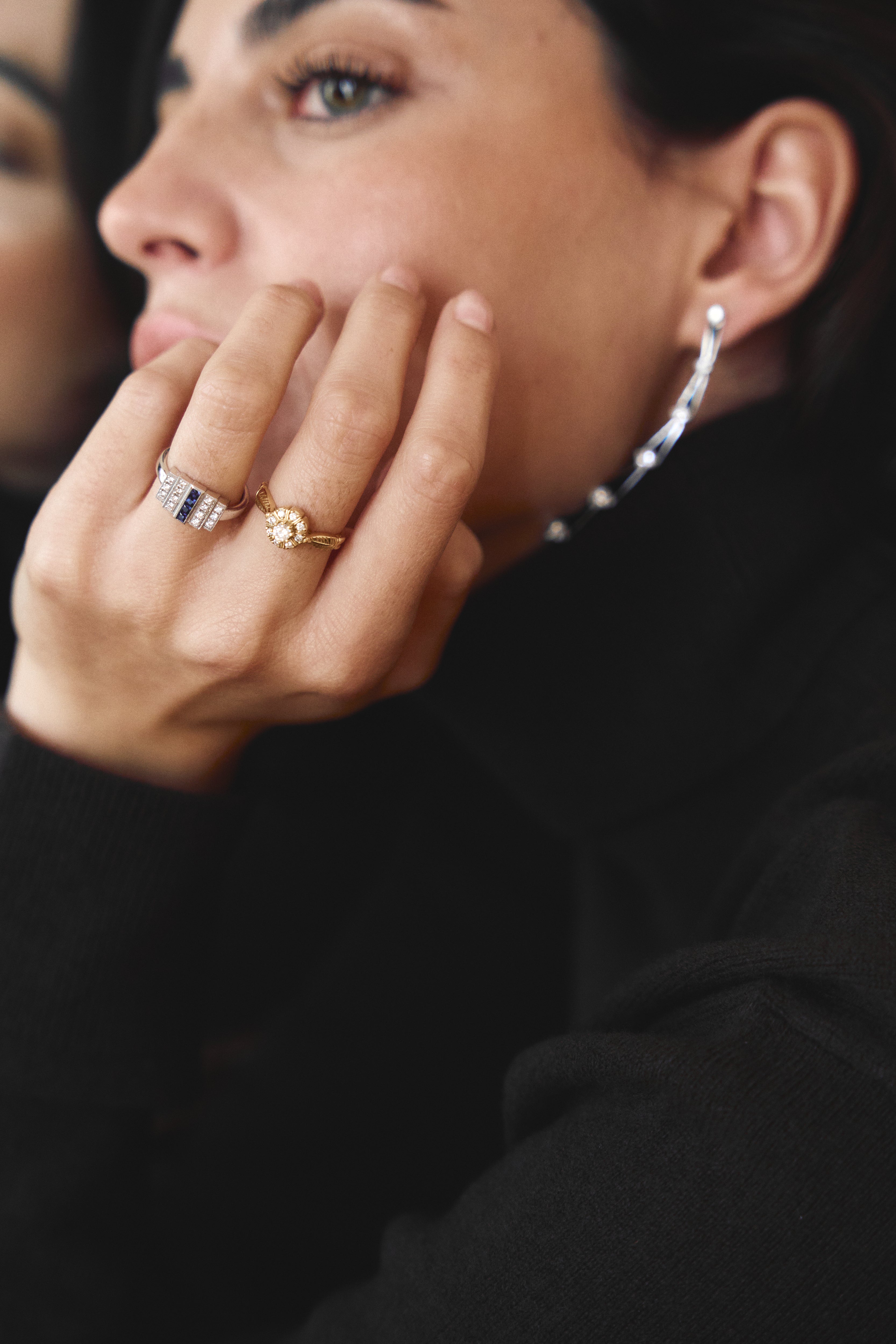 Una maravilla de sortija en oro blanco, con zafiros y brillantes estilo art decó. Las piedras dispuestas de forma escalonada hacen que la joya se integre a la perfección con el dedo creando así un diseño sutil y elegante.